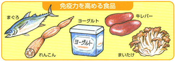 まぐろや牛レバーなどに多く含まれるビタミンB6や、まいたけに含まれる多糖タンバクには、免疫機能を正常に整える働きがあります。ビタミンB6は不足するとアレルギー症状を招きやすくなります。