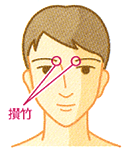 両眉の内側のくぼみにある攅竹は、人さし指と親指で眉間をはさみ込むようにしてもむ。