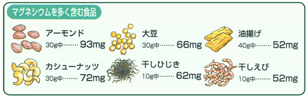 マグネシウムはアーモンド、カシューナッツ、大豆など、加工していない食品に広く含まれ、カルシウムは小魚、牛乳などに多く含まれています。
