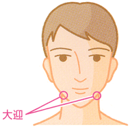 唇の端の斜め下、下あごの骨のくぼみにある大迎は、指の腹で繰り返し、ぐっと押し込むように指圧する。
