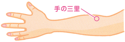前腕の親指側、肘の曲がり目から手の先に向かって指幅約2本分にある手の三里は、親指の先が皮膚に沈むくらい、やや力を込めて押す。