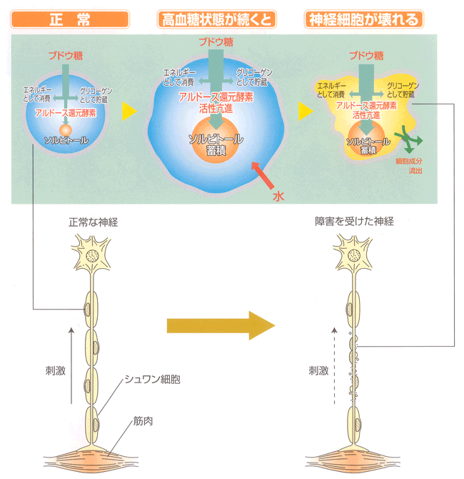 ブドウ糖は末梢神経のシュワン細胞という、神経の刺激を伝える軸索(じくさく)を構成する細胞の中に入ると、アルドース還元酵素の働きでソルビトールになります。ソルビトールは脱水素酵素により果糖になりますが、血糖が高いとソルビトールがたくさん作られて細胞内にたまります。その結果、細胞の働きが失われて神経障害が起るのです。
