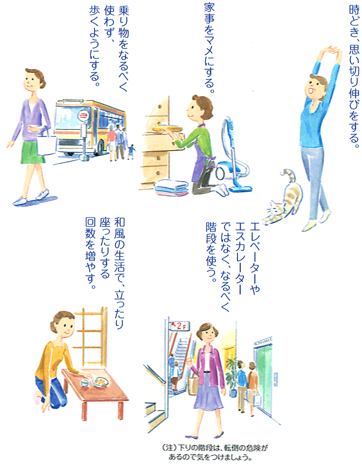 ウォーキングをしても大丈夫、と言われた方でも、いきなり激しい運動をするのは危険です。筋肉や関節を痛めたり、疲労骨折を引き起こすことがあります。家事をマメに行うなど、少しずつ身体を動かしていくことが大切です。慣れてきたら、ご近所を散歩して、徐々に距離を伸ばすようにします。無理せず、気」持ち良く歩ける速さで歩きましょう。